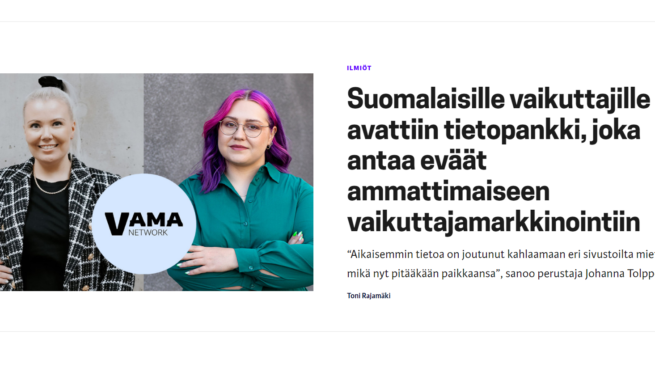 VAMA Network, tuttavallisemmin VAMA, on kaikenkokoisten vaikuttajien oma tietopankki ja yhteisö. Visionamme on kehittää vaikuttajamarkkinointilalaa sekä ajaa vaikuttajien etuja heitä auttamalla.